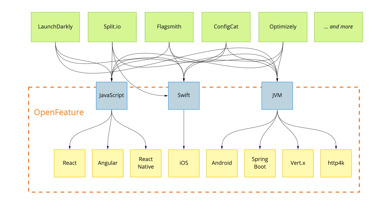 My hope is that OpenFeature will do the same for feature flagging. This can happen at two levels. Firstly, OpenFeature will provide a single target for framework-specific feature flag evaluation, which can be done in a really idiomatic, ergonomic way. For example, a React feature flagging client can provide flag evaluation mechanisms using hooks, providers and components, rather than plain old Javascript functions. This idiomatic addition is an example which various vendors have made already, but such ergonomic improvements are spread across each vendor-specific library, and frankly none of them are perfect. If we could get to a single, vendor-neutral library then engineering effort could be focused in one place, and users of the client would not need to re-learn a slightly different API for each vendor. This same situation applies for every runtime that needs feature flag evaluation - we can build a single, standard feature flag evaluation client for Android, React Native, iOS, Spring Boot, Elixir, Django, Fastify, Vertx, gin, and so on. And each of these clients can provide a rich, idiomatic API that provides a great developer experience in each of these frameworks.